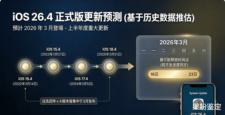 虽然 Apple 并未公开 iOS 26.4 正式推出日期,但从过去数年的 x.4 版本发布纪录,预计在 2026 年 3 月下旬推出 iOS 26.4 正式更新,作为上半年度 iPhone 最大系统更新。